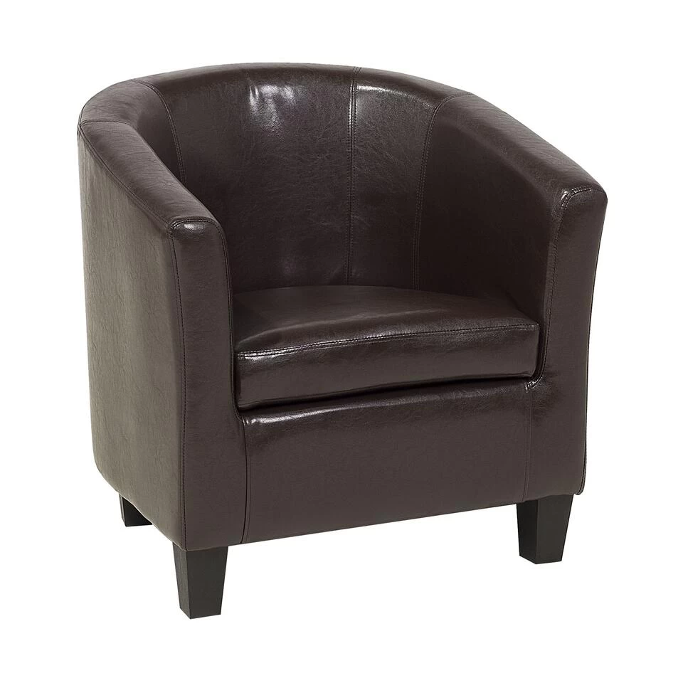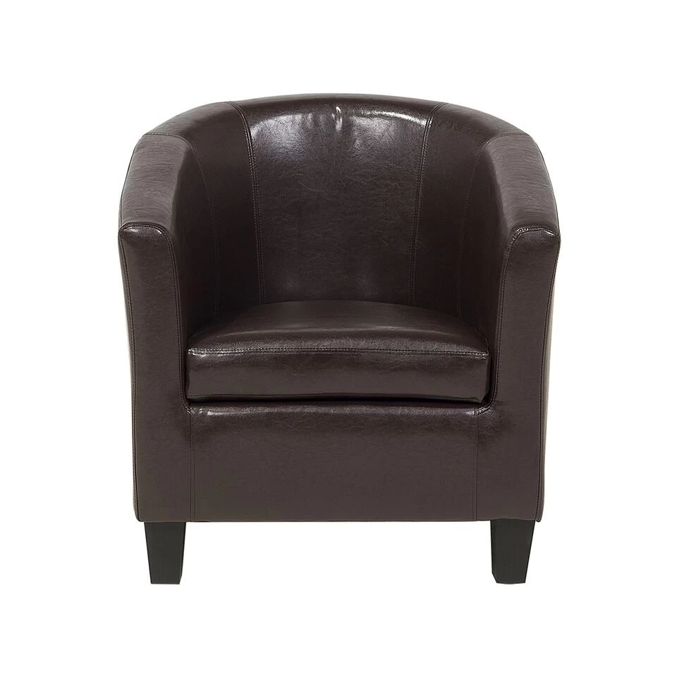 Fauteuil in bruin, glanzend kunstleer. Deze charmante fauteuil is comfortabel en geeft een gezellige sfeer in elke woonruimte. De glans van het bruine kunstleer onderstreept de charmante uitstraling en met zijn klassieke, gebogen vorm past het bij elke interieurstijl.